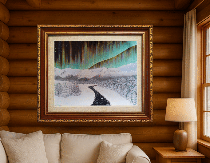 Wildlife paintings, forest landscapes, mountain scenes, and northern sky artwork are among the most popular choices for cabin decor.