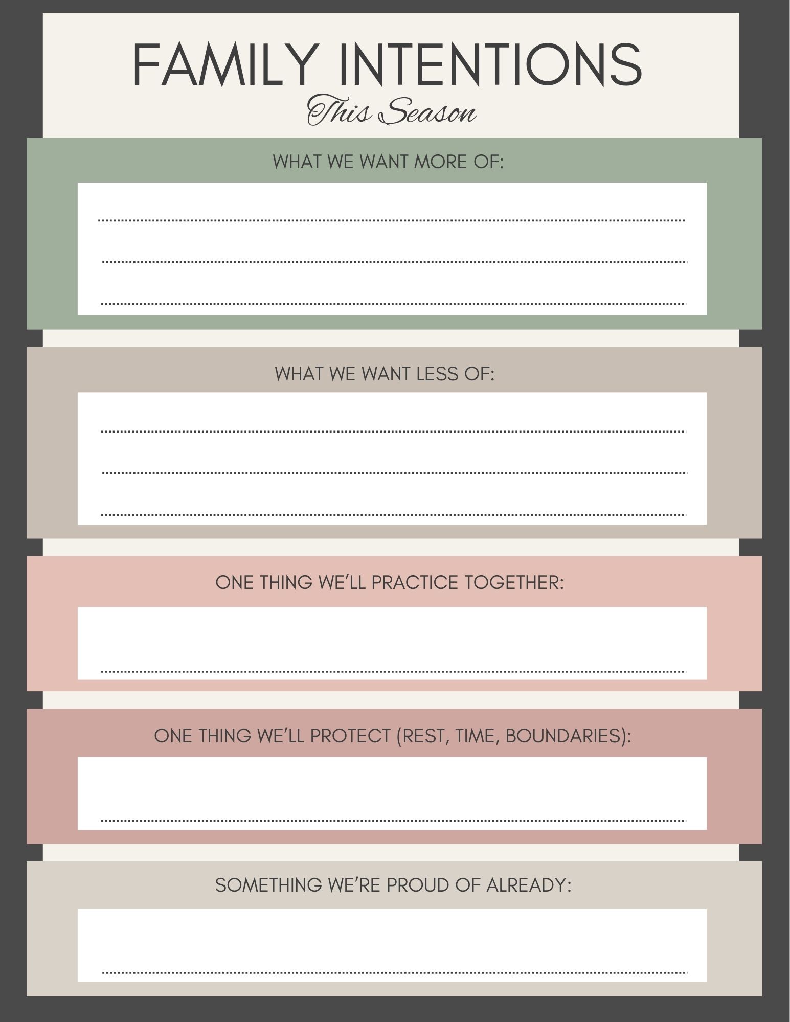 The Family Intentions Printable is a gentle reflection and goal-setting tool designed to help families slow down, communicate clearly, and intentionally shape the kind of home environment they want to create together.