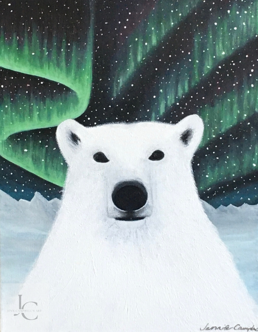 This polar bear painting, titled “Northern Guardian,” captures the strength of Arctic wildlife beneath shimmering northern lights.  Bring home the wild beauty of the Arctic with Northern Guardian — an 11×14 painting that captures a soulful polar bear standing tall beneath a swirling aurora sky. This powerful winter piece blends rich tones and soft light to create a sense of strength, peace, and northern magic.